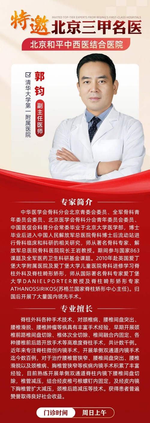 郭钧主任长期在北京和平中西医结合医院坐诊,是广大脊柱及骨科疾病患者寻求国内顶尖、国际同步诊疗技术的理想选择!机会难得,敬请把握!